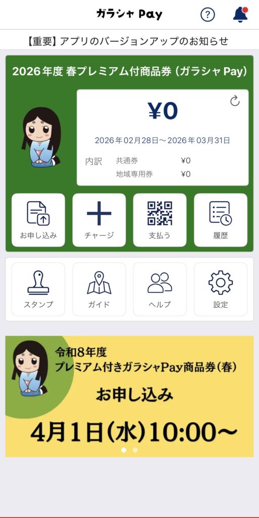 ◎アップデート不要: 背景が「緑色」の方※画面に「2026年春プレミアム付商品券(ガラシャPay)」と表示されている方は最新版です。